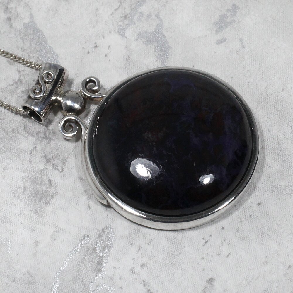 This pendant features natural sugilite set in .925 silver. Sugilite is a relatively rare crystal with a soothing, optimistic energy. It is believed to cure migraines, headaches and anxiety.