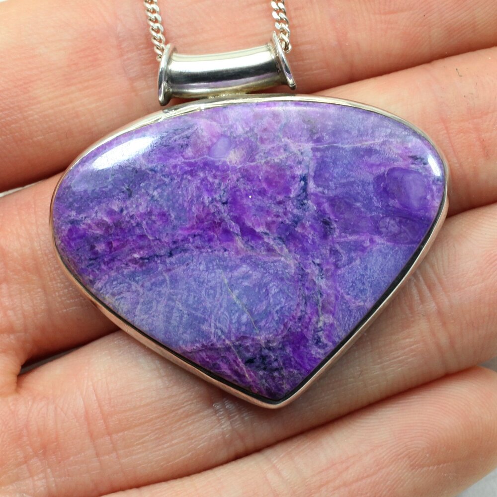 This pendant features natural sugilite set in .925 silver. Sugilite is a relatively rare crystal with a soothing, optimistic energy. It is believed to cure migraines, headaches and anxiety.