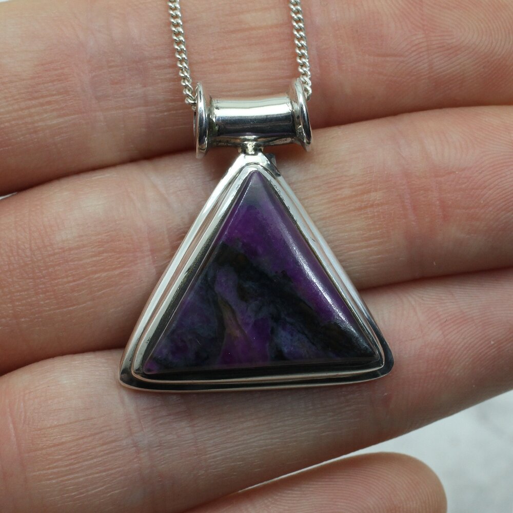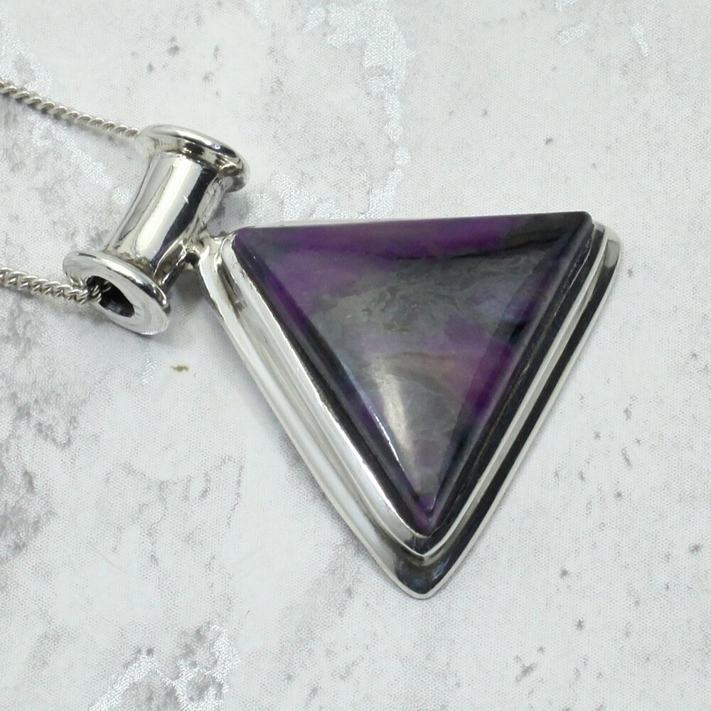 This pendant features natural sugilite set in .925 silver. Sugilite is a relatively rare crystal with a soothing, optimistic energy. It is believed to cure migraines, headaches and anxiety.