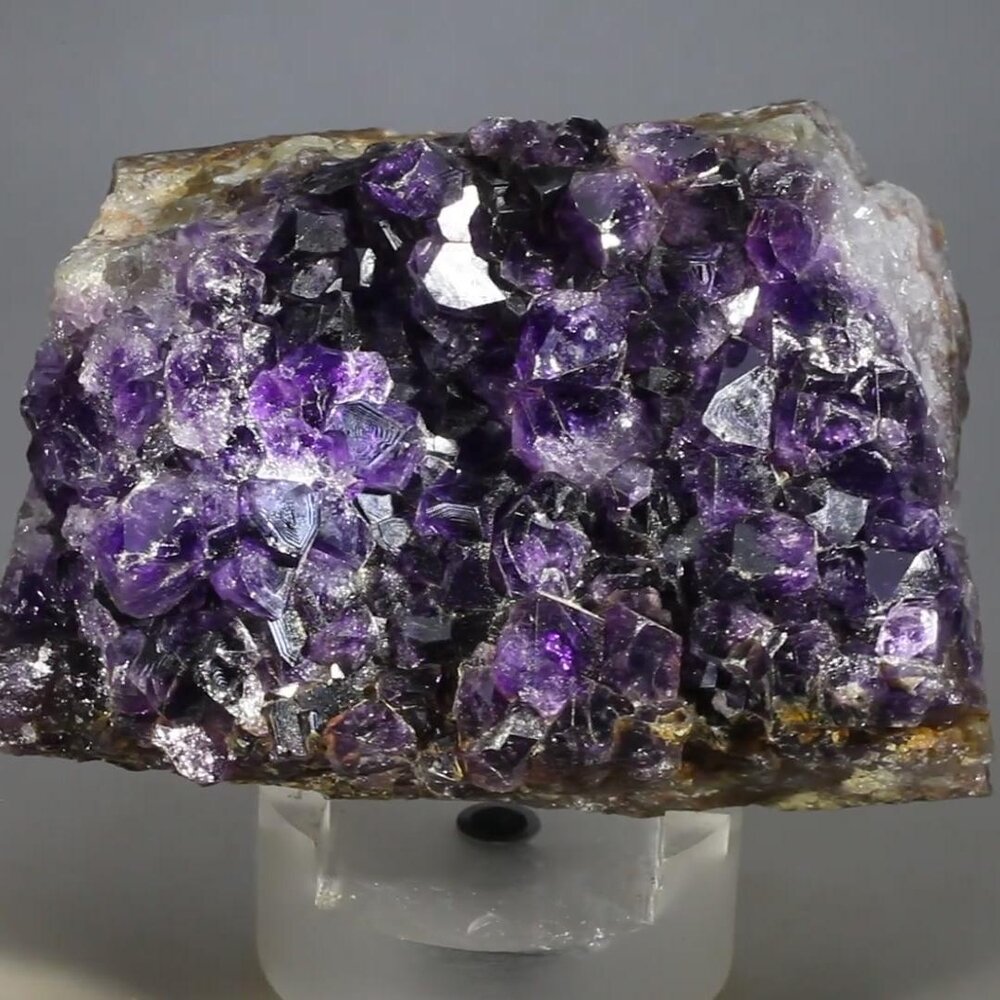 With lustrous crystal points of the deepest purple, this super grade Uruguayan amethyst piece sparkles beautifully as the light is reflected from its crystal faces.