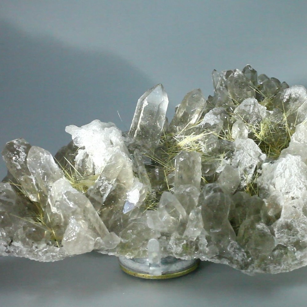 This wonderful Smoky Quartz with Golden Rutile Cluster has amazing strands of golden rutile that shine in sunlight. It is very eye-catching and highly graded and therefore ideal for display, crystal healing and collecting.