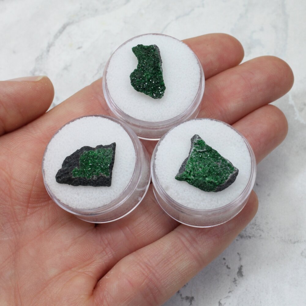 A small druze of sparkling Uvarovite crystals from the Urals, Russia. Uvarovite is excellently calming and cheering, allowing us to recognise the emotional root of illness and move on from difficult situations.