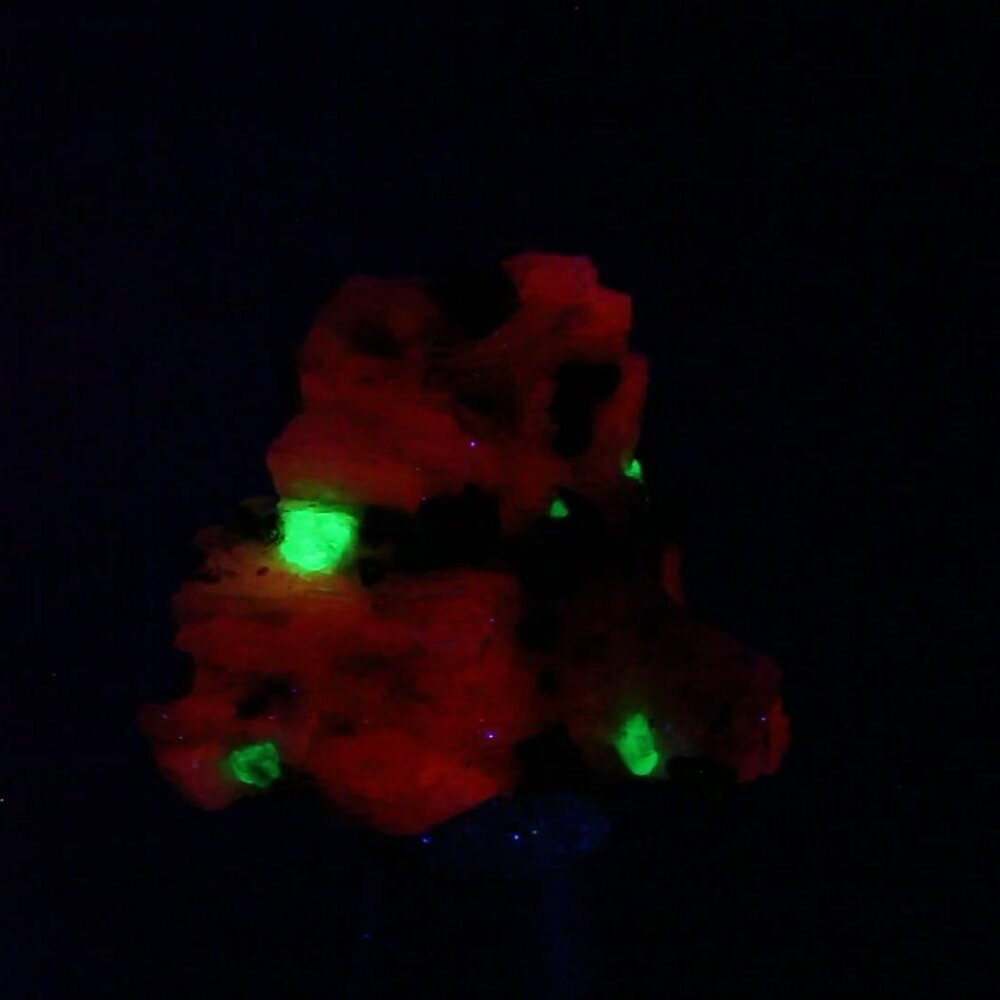 Also present is minor Zincite, all in a matrix of Calcite which fluoresces a vibrant salmon pink.