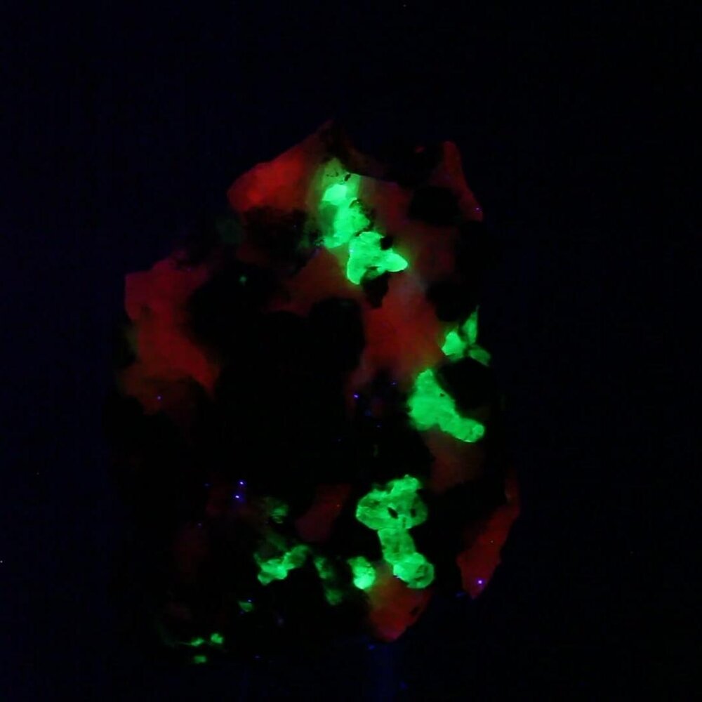 Also present is minor Zincite, all in a matrix of Calcite which fluoresces a vibrant salmon pink.