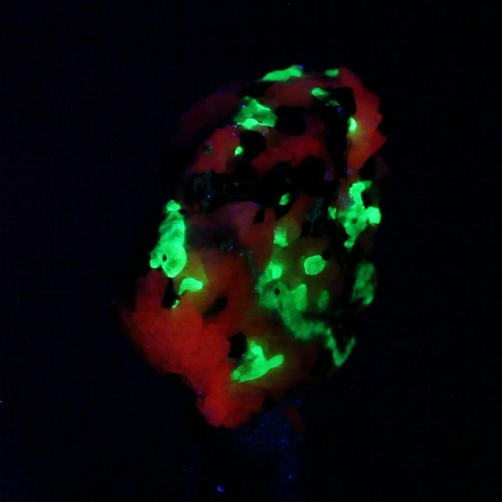 Also present is minor Zincite, all in a matrix of Calcite which fluoresces a vibrant salmon pink.