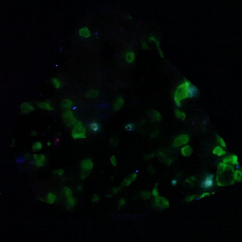 Willemite is a highly fluorescent mineral from the Franklin mining district, New Jersey, U.S.A. Under Long Wave UV it fluoresces a vibrant green.