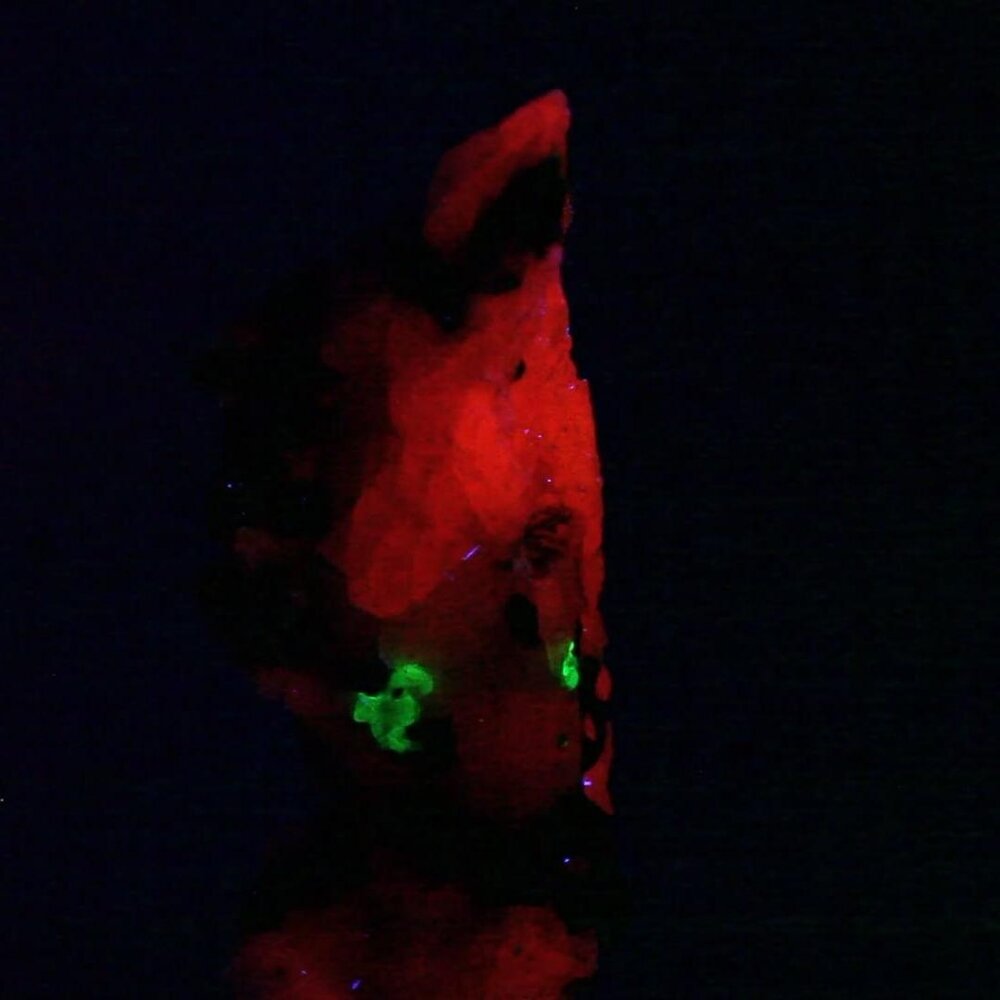 Also present is minor Zincite, all in a matrix of Calcite which fluoresces a vibrant salmon pink.