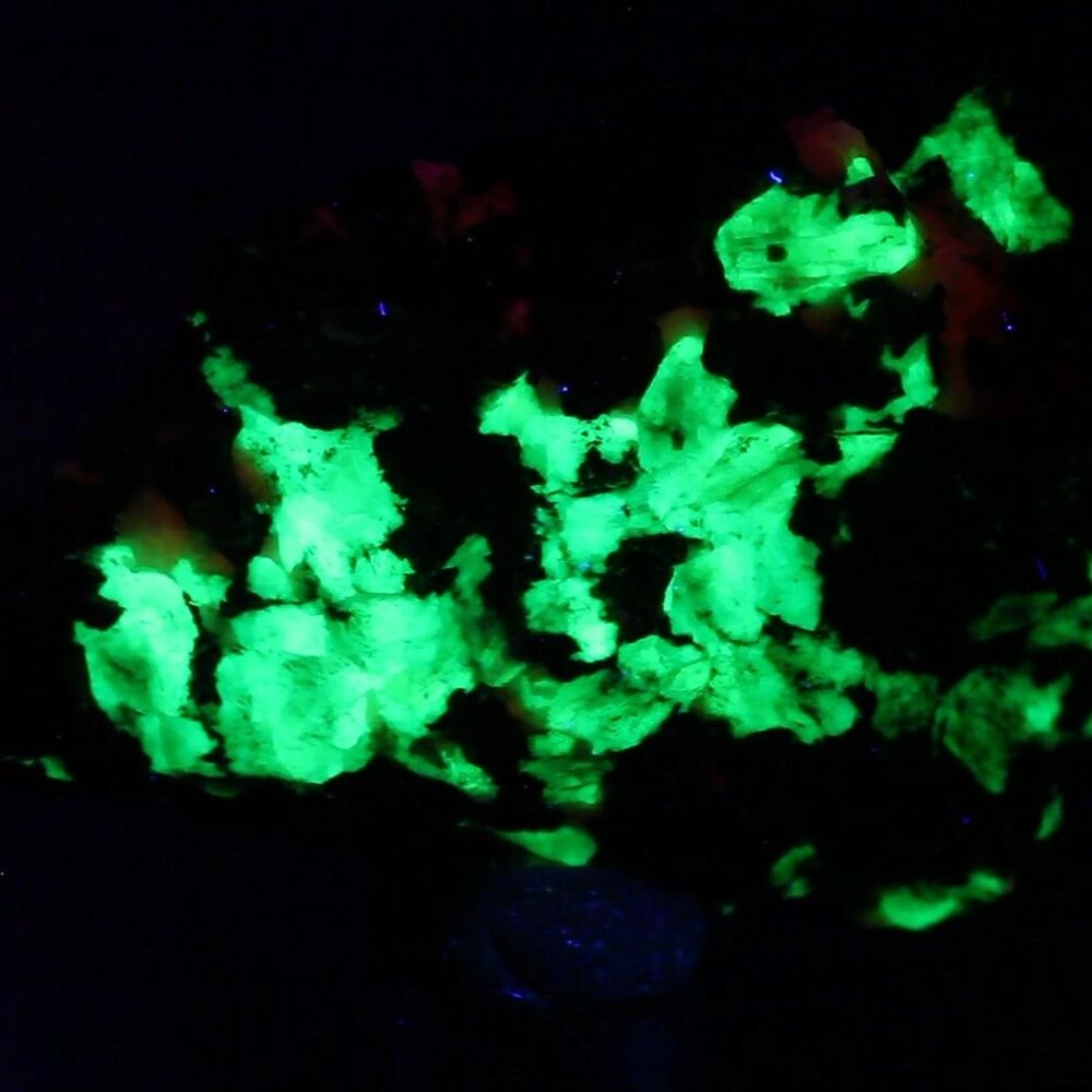Also present is minor Zincite, all in a matrix of Calcite which fluoresces a vibrant salmon pink.