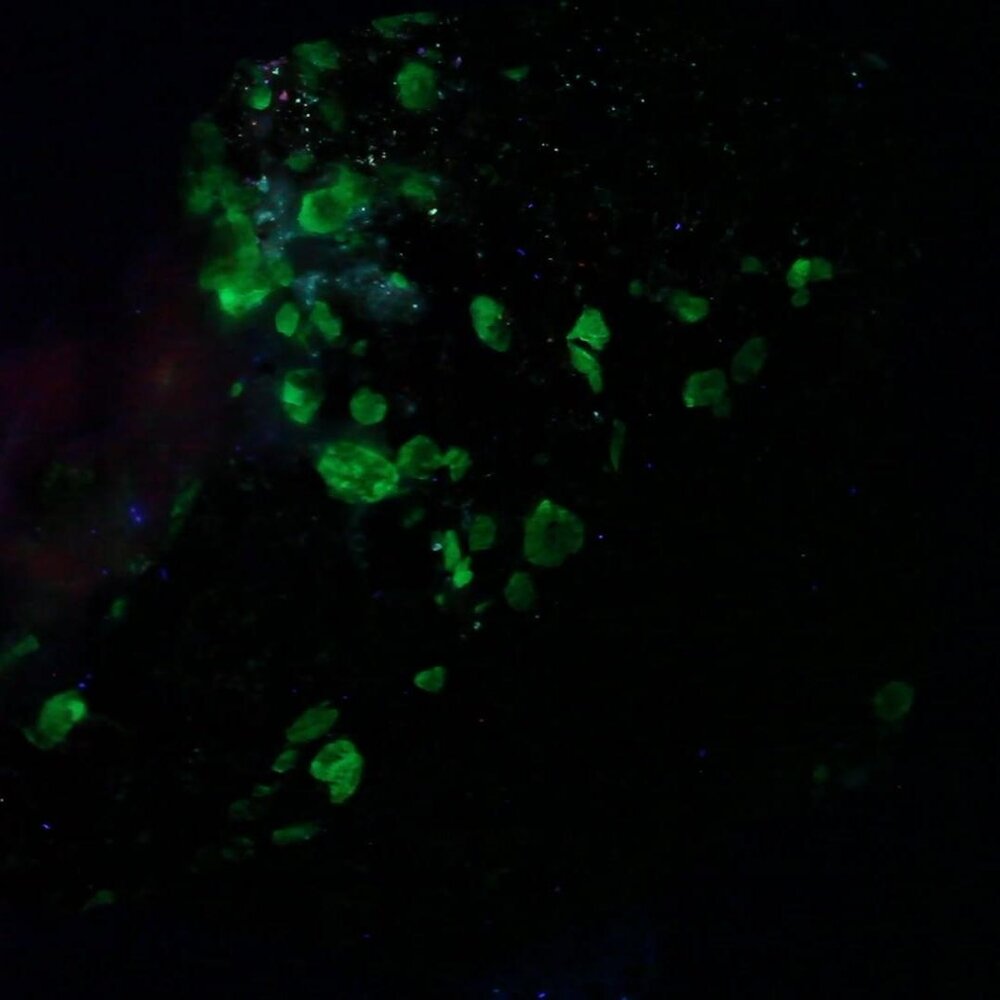 Willemite is a highly fluorescent mineral from the Franklin mining district, New Jersey, U.S.A. Under Long Wave UV it fluoresces a vibrant green.